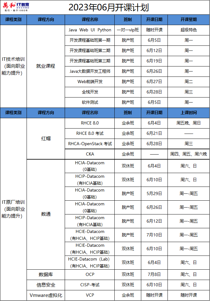 世上没有轻而易举就能获得的成功。 所有大放异彩的背后,都是超乎寻常的努力;真正能够登顶远眺的,都是那些心无旁骛、坚持着往前走的人。再坚持一下,也许你离成功就差那一步。 万和IT教育六月开课计划上新啦~