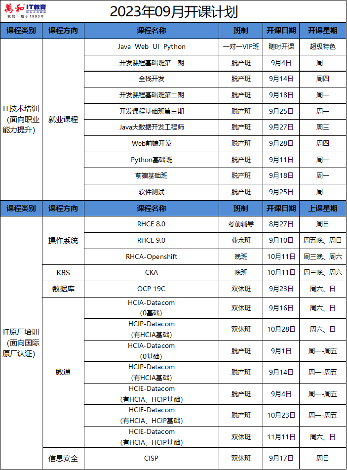 国庆小长假要到了,是不是已经在扒旅行攻略、攒着肚子想打卡美食?放松归放松,也能给假期后的自己铺个“成长台阶”——毕竟歇够了,才跑得更稳。你可能没注意,每年国庆一过,IT圈就会有波“职业冲刺潮”——10月刚好是把“模式”掰回“学习模式”的*佳窗口!万和的10月开班计划早就...