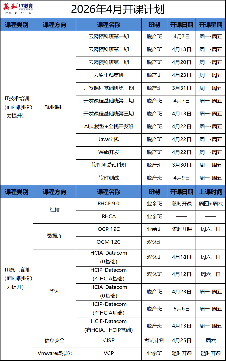 无论你是0基础想转行入高薪IT圈,还是在职人士想进阶加薪,4月开课计划都能精准匹配:大厂导师面授、一对一答疑、灵活排班不耽误工作,更有就业保障+春招名企内推双重支持,让你学习无忧、求职有门!